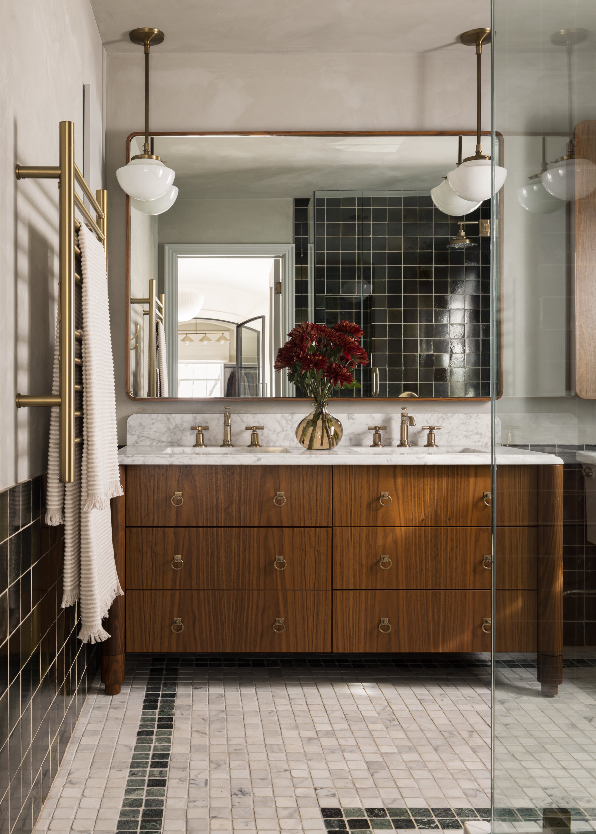 This Sunset Hills French Traditional home has a barrel vaulted primary bedroom ceiling with arched barrel vaulted dormers, all following the same arc. With the homeowners permission we put their primary closet on display with arched iron French doors that also followed the barrel vault. Opposite the walk in closet is the primary bathroom with a rich walnut and reclaimed tumbled marble mosaic floors.